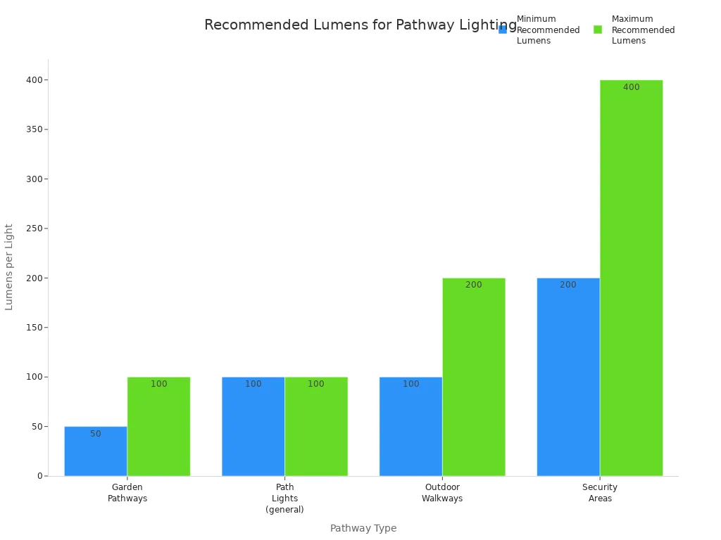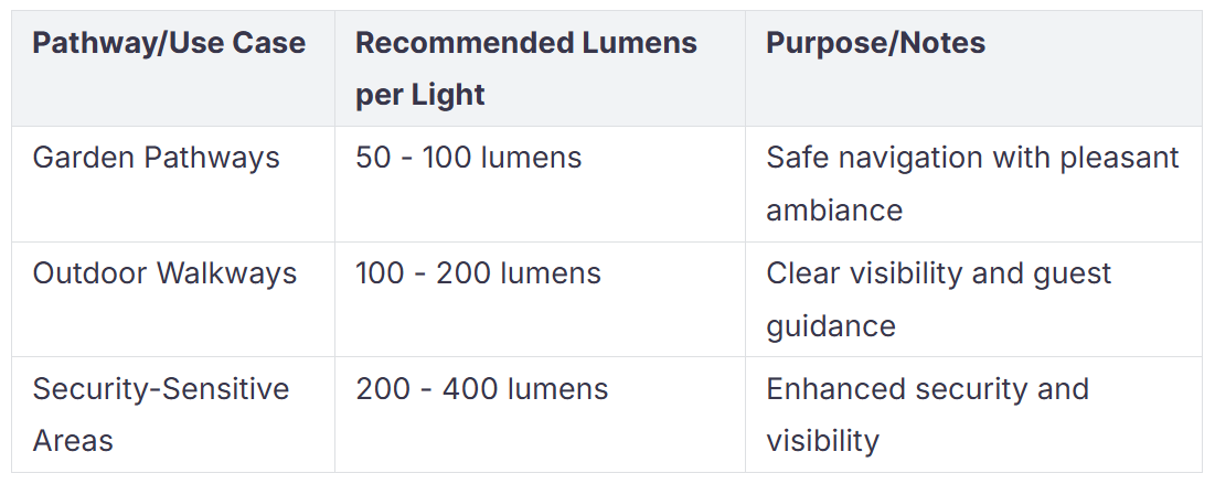 On tärkeää, että ulkona on turvalliset polut. Reittivalaistus auttaa ihmisiä näkemään, missä mennään. Se pysäyttää myös kompastumisen ja putoamisen. Käytä puutarhapoluille 50–100 lumenin valoja. Kulkukäytävät tarvitsevat 100–200 lumenia hyvän valon saavuttamiseksi. Jos haluat lisää turvallisuutta, käytä 200–400 lumenia valoa kohden. Aseta ulko-LED-valot 6–8 metrin päähän toisistaan tasaisen valon saamiseksi. Kapeat polut tarvitsevat valoja lähemmäs toisiaan. Leveillä poluilla valot voivat olla kauempana toisistaan. Aseta valot noin 14 tuumaa maanpinnan yläpuolelle. Tämä antaa suoran säteen ja saa polun näyttämään mukavalta.