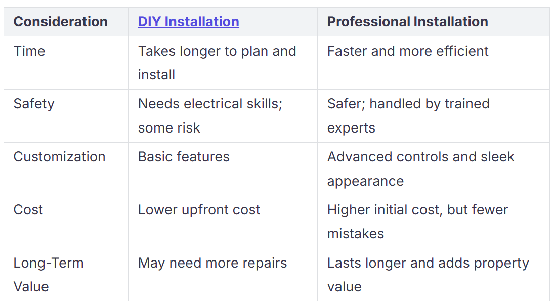 Voit asentaa ulkona led-valot itse tai pyytää apua. Itse tekeminen säästää rahaa ja antaa sinun valita mallin. Sinun täytyy tietää joitain asioita sähköstä ja varata aikaa suunnitteluun. Jos teet virheitä, se voi olla vaarallista tai rikkoa valot.