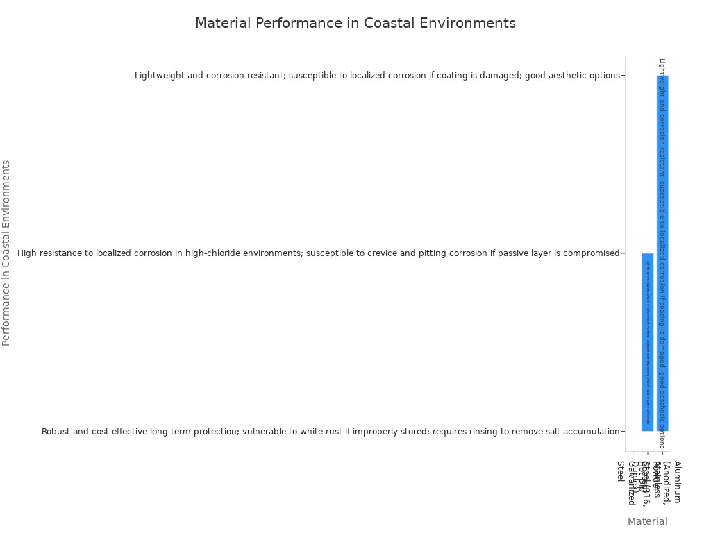 Valmistajat käyttävät jauhemaalauksia ja sinetöityjä kansia pidentääkseen valojen käyttöikää. Nämä ominaisuudet auttavat säänkestävää led-valoa selviytymään myrskyistä, märästä ilmasta ja suolasuihkusta. Alla olevasta kaaviosta näet kuinka eri materiaalit toimivat lähellä merta: